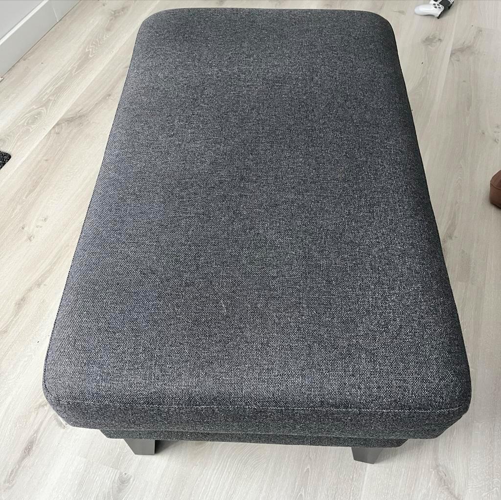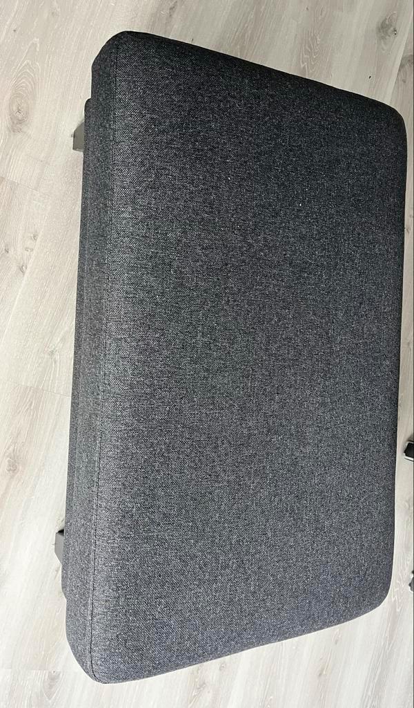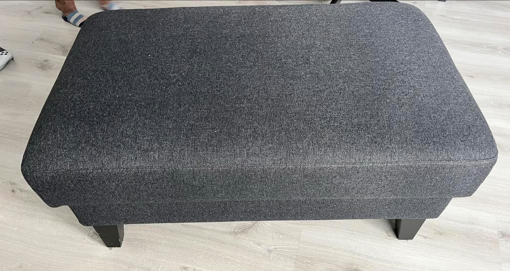 Comfortabele grijze voetenbank bekleed met stof. De voetenbank is rechthoekig van vorm en in gebruikte, maar goede staat.