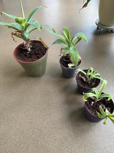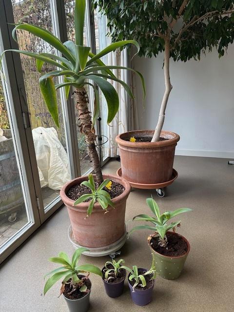 Agave attenuata stekken. Ze zijn geworteld. Ter illustratie foto 2 de stekjes met de moederplant. Deze moederplant is niet te koop. Graag eigen plantpotjes meebrengen