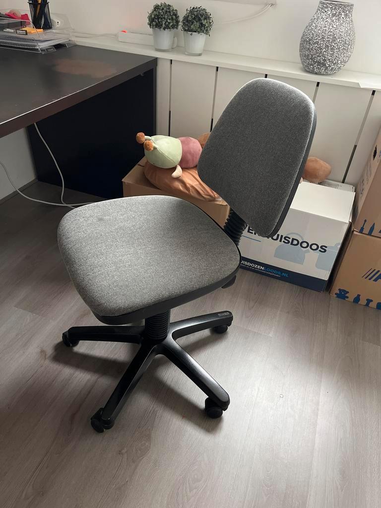 De stoel is in goede staat. De stoel is in hoogte verstelbaar en heeft een draaibaar onderstel.