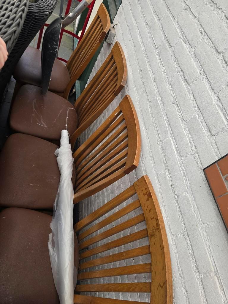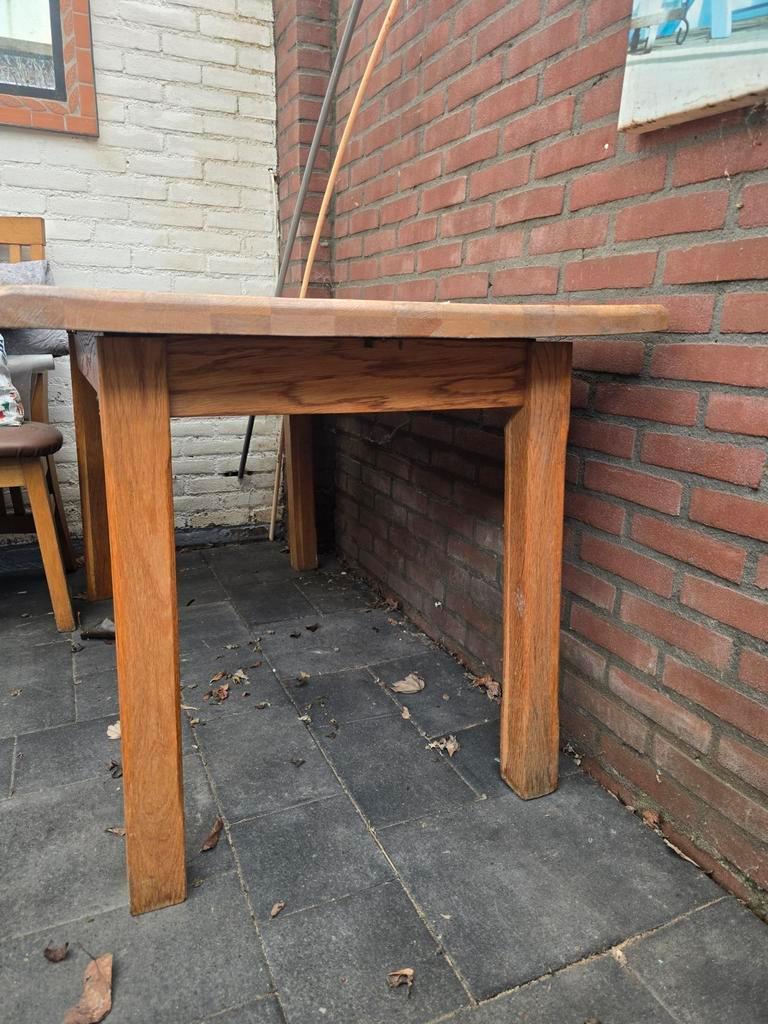Deze houten tafel en 4 stoelen staan al langer buiten altijd onder de overkapping. Hebben we onder het klussen als lunch/opslag tafel gebruikt stevig en mooi klein voor maat. Mag gratis opgehaald word