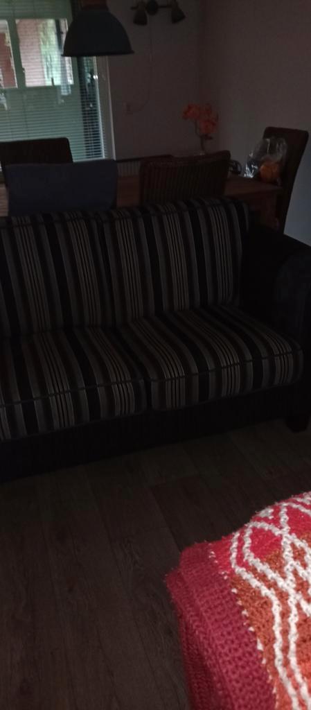 Comfortabele en ruime twee-zits bank. De bank heeft een gestreepte bekleding en is in goede staat. Ideaal voor een kleine woonkamer of appartement. Biedt voldoende ruimte om lekker te ontspannen. Bree