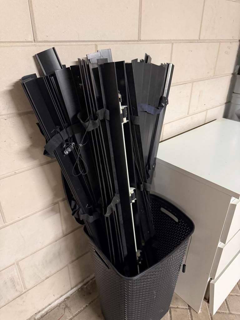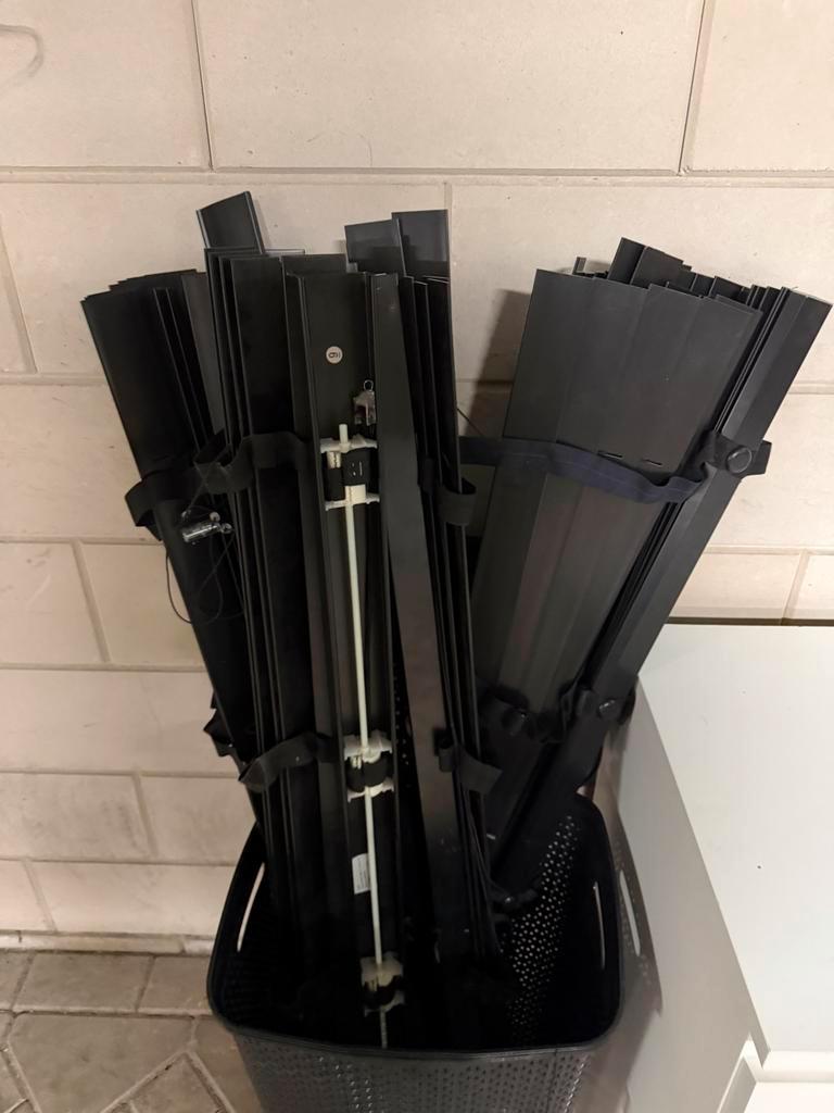 Zwarte jaloezieën in goede staat. Verschillende maten beschikbaar. Ideaal voor het verduisteren van kamers en het creëren van privacy. Afmetingen variëren, zie foto''s voor details.