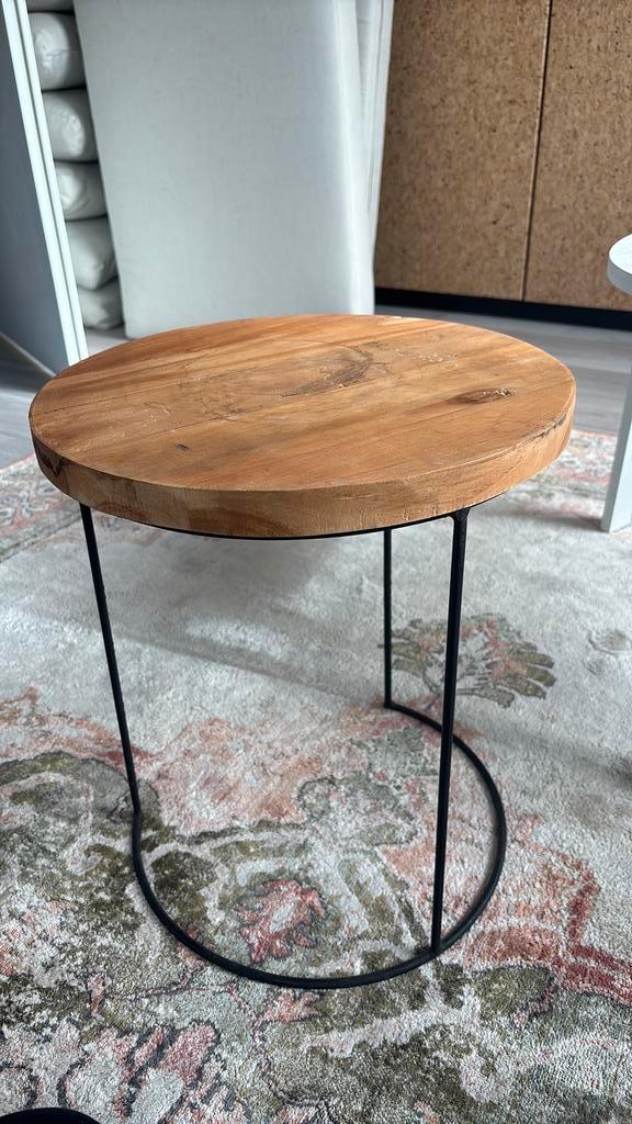 Klein tafeltje diameter 38 cm zit een vlek op de bovenkant omdat er een pot op heeft gestaan. Gaat met schuren waarschijnlijk wel weg.