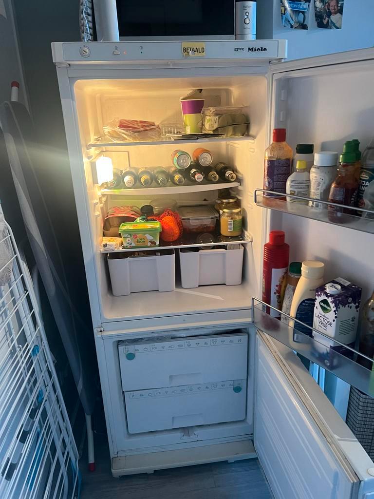 Oude miele (vries)koelkast, doet het nog prima. Gratis af te halen vanwege de stickers. Bovenste plankje houders brokkelen wat af, maar verder in prima staat.