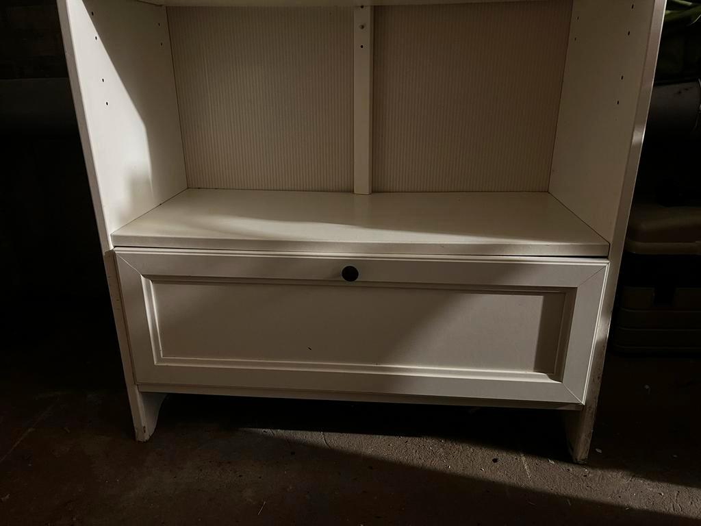 Mooie witte kast met een lade. Ideaal voor extra opbergruimte in de woonkamer, slaapkamer of kinderkamer. De kast is in goede staat en biedt voldoende ruimte voor boeken, kleding of andere spullen.