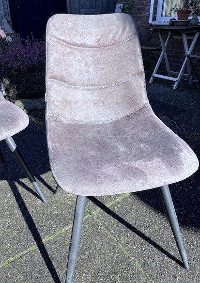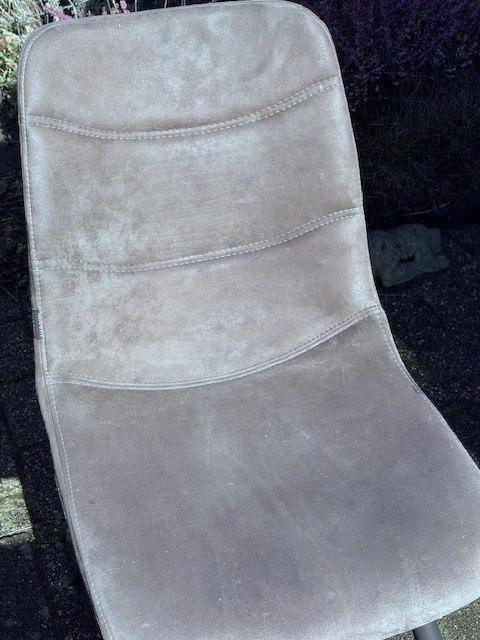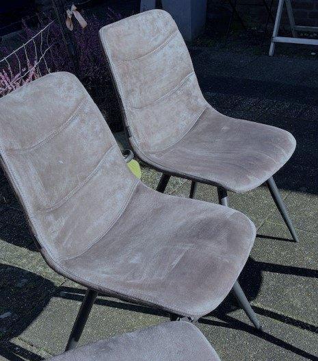 4 stuks taupe kleurige eetkamerstoelen. Ze zijn in gebruikte staat, maar niet kapot. Stoelen hebben in de stof een vleug en zijn met stalen pootjes.