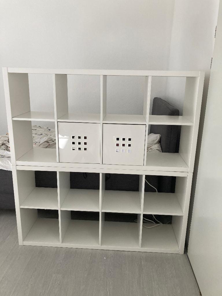 Twee kallaxkasten (2x4 vakken) op elkaar gestapeld, waardoor het een 4x4 kallaxkast lijkt. Ik verkoop de kasten apart of samen. Dozen mogen ook mee. Er zitten gebruikssporen op. De bovenste kallax is