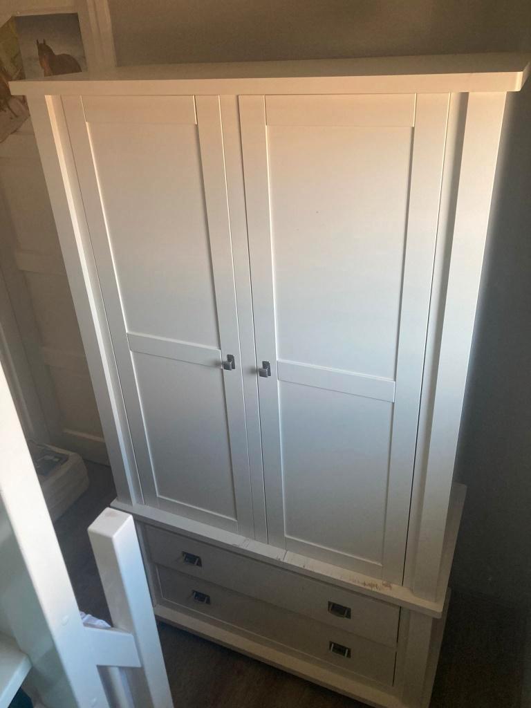 Witte kast. Kleine beschadiging bij de deuren aan de onderkant. 2 Lades aan de onderzijde.